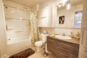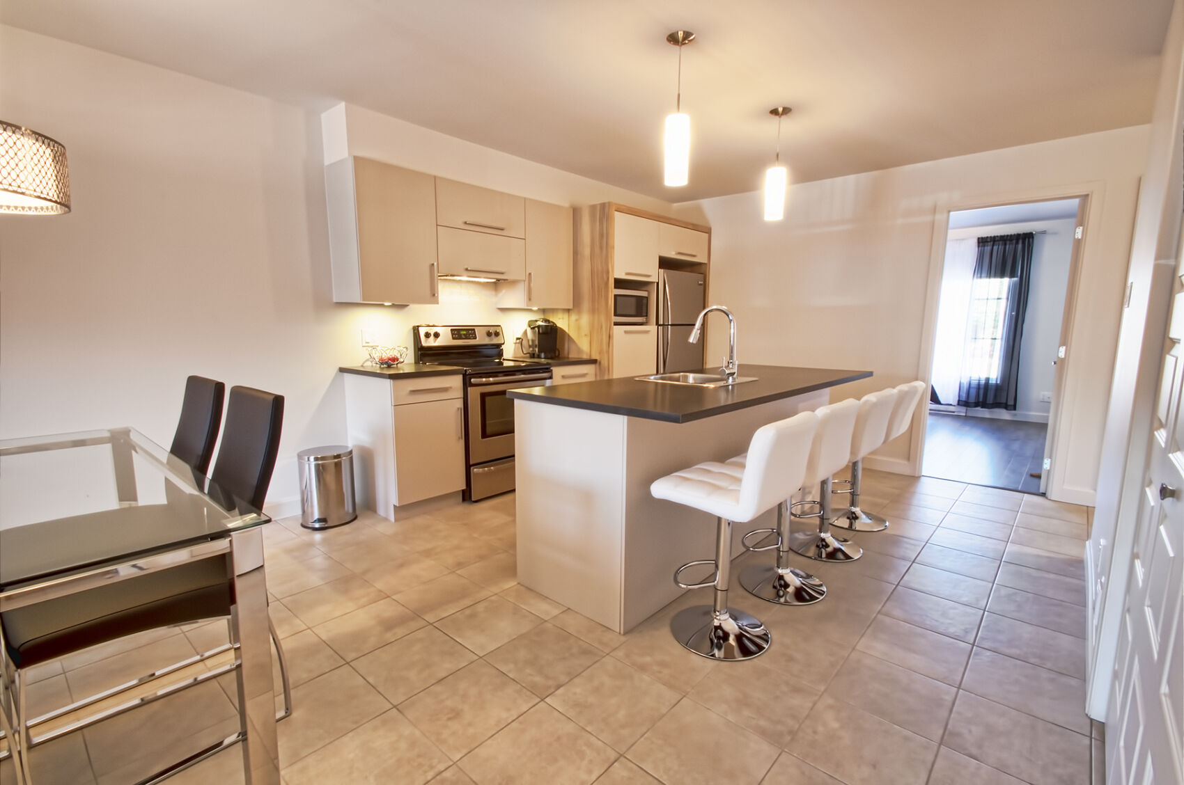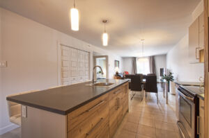 Le logement au rez-de-chaussée comporte une cuisine moderne avec îlot central, salle à manger et salon à aire ouverte, 2 grandes chambres, walk-in dans la chambre principale et une salle de bain complète. Le logement comprend une bonne insonorisation avec des murs et un plancher de béton.