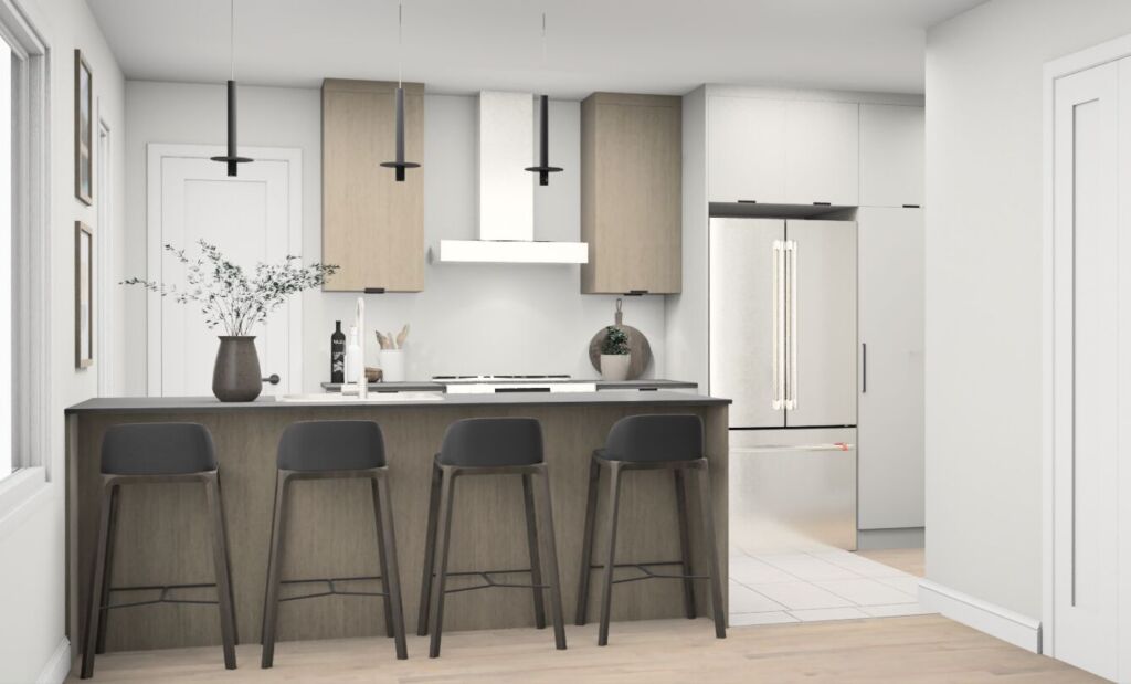 Au rez de chaussé se trouve le hall d’entrée avec un walk-in, une cuisine avec îlot central et garde-manger walk-in, ainsi que la salle à manger, le salon et une salle d’eau. Ce plan a été conçu pour optimiser l’espace en créant une vaste aire ouverte.