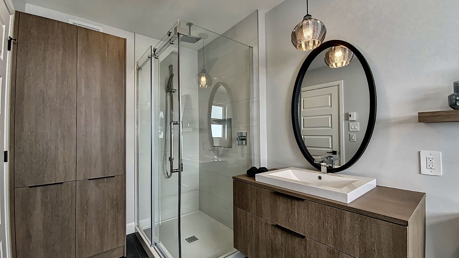Au rez-de-chaussée se trouve le hall d’entrée, la cuisine avec un grand îlot central et un garde-manger walk-in, la salle à manger, le salon, ainsi que la salle d’eau.
